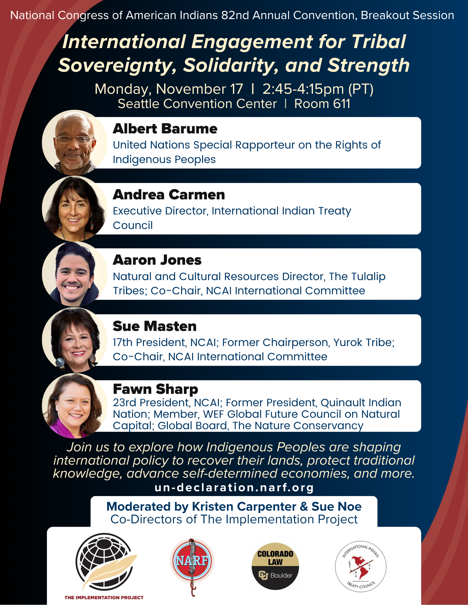 For generations, Tribal Nations have defended sovereignty not only at home but also on the world stage. Today, the stakes are higher than ever. This breakout session will explore how Tribes are shaping international policy and finance to secure land recovery, protect traditional knowledge, advance self-determined economies, and more. Leaders will share updates from key global arenas—including the World Intellectual Property Organization, the World Economic Forum, the UN Permanent Forum on Indigenous Issues, the Expert Mechanism on the Rights of Indigenous Peoples, and the UN Special Rapporteur. Together, we will chart global strategies to strengthen solidarity across nations and generations. Sponsored by The Implementation Project, a joint initiative of the Native American Rights Fund and the University of Colorado Law School; with support from the International Indian Treaty Council.